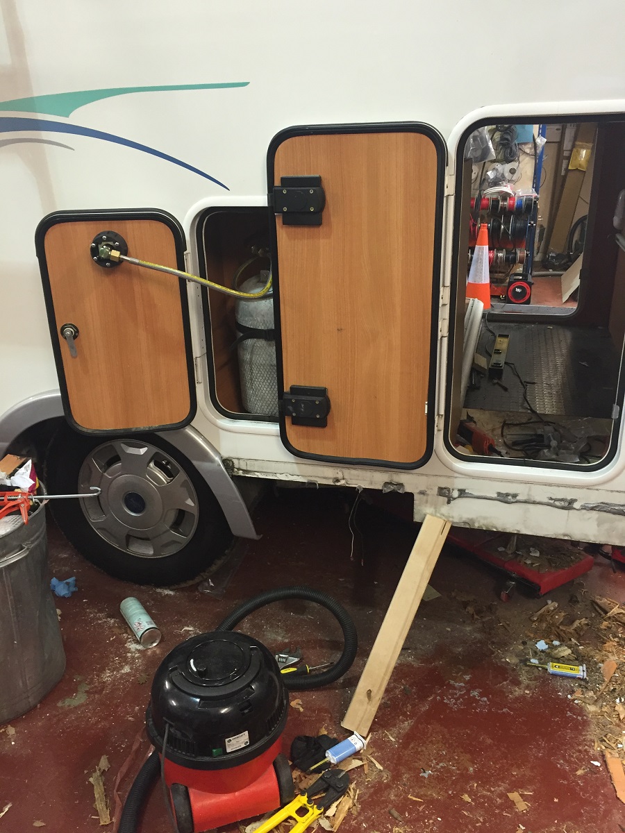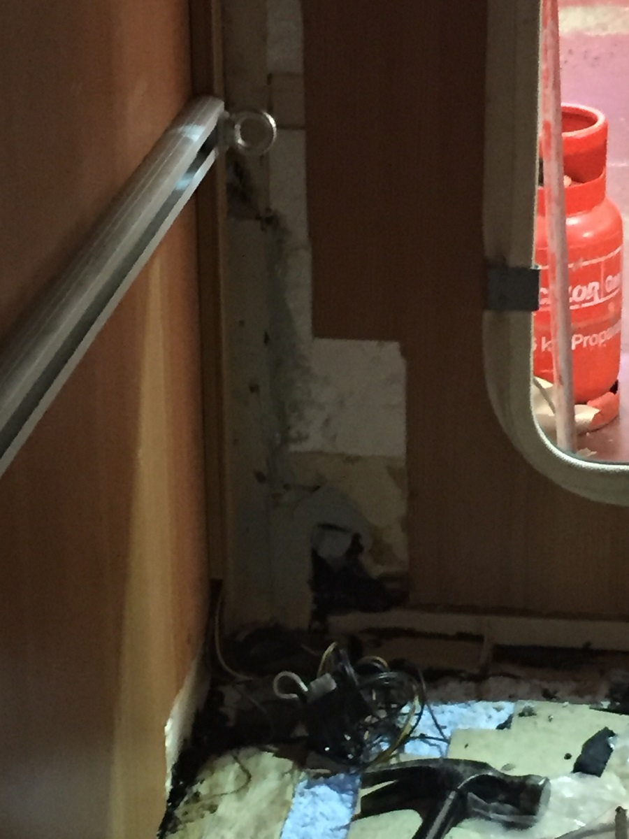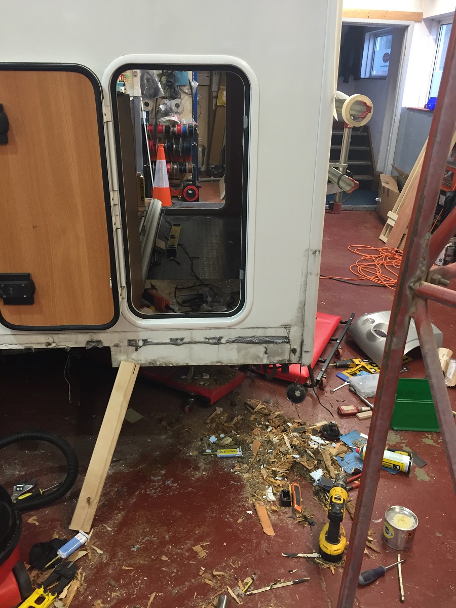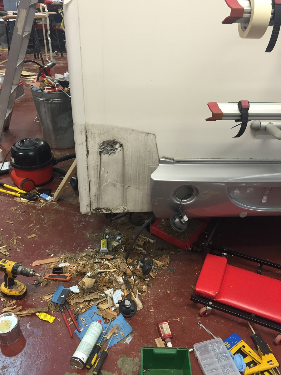 A customer's Ford Hobby motorhome was damp in the garage area. After inspection it was clear that reflectors had been stuck on the back of the motorhome on each side, one had been used to cover up damage in the bodywork which had led to water ingress. So we got stuck in and started stripping the damp timber out.