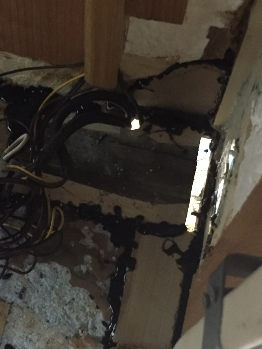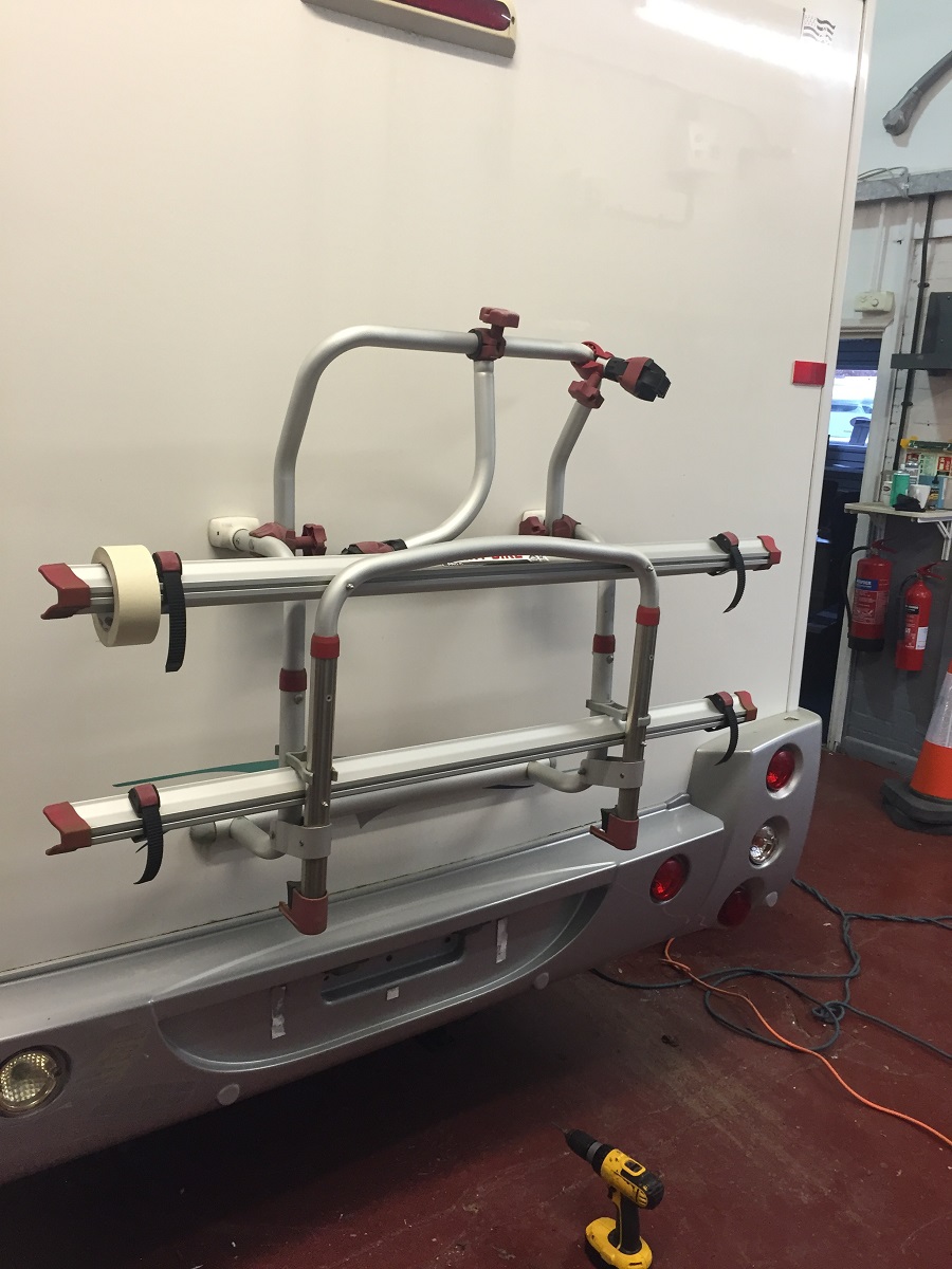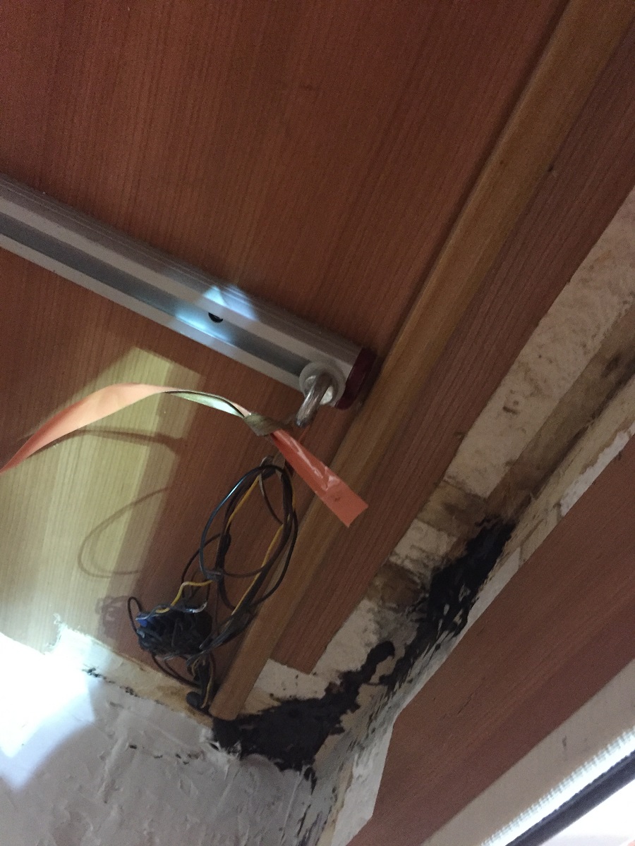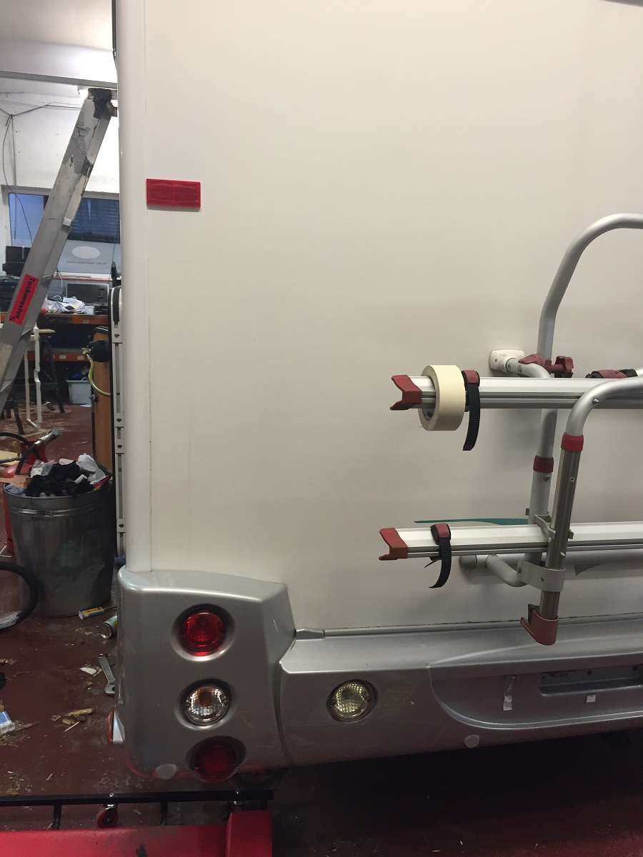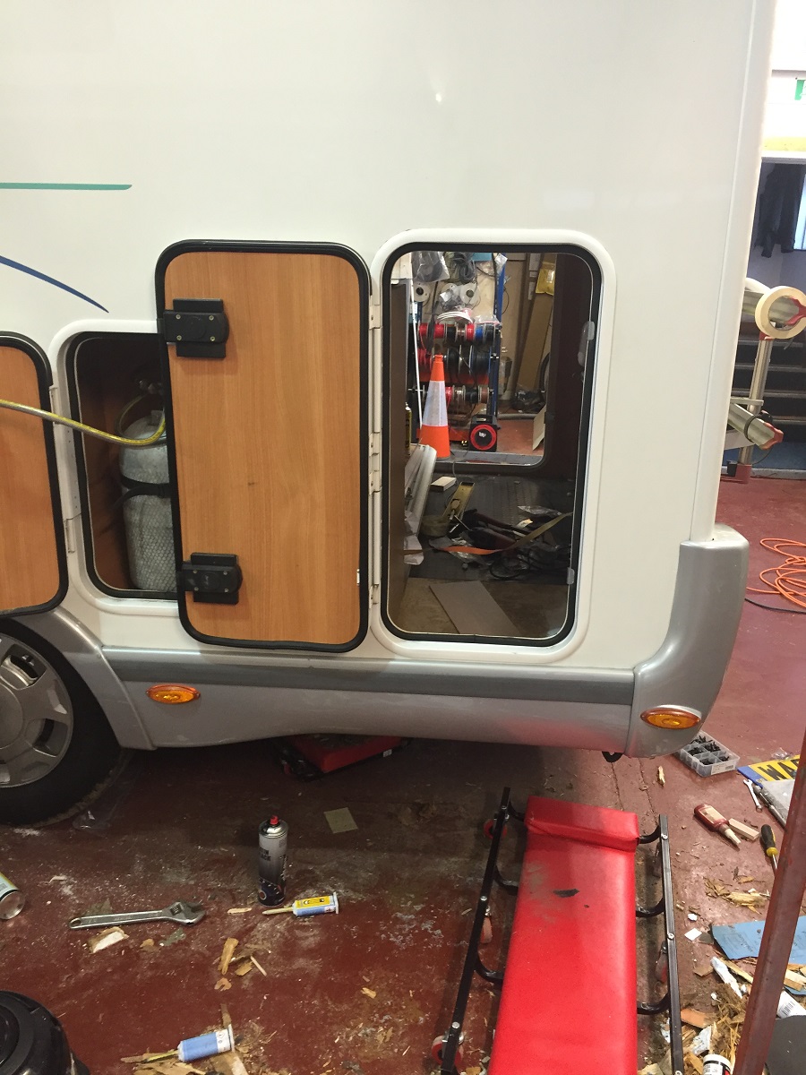 A customer's Ford Hobby motorhome was damp in the garage area. After inspection it was clear that reflectors had been stuck on the back of the motorhome on each side, one had been used to cover up damage in the bodywork which had led to water ingress. So we got stuck in and started stripping the damp timber out.